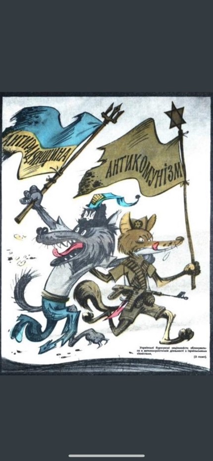 The text reads: “The wolf and the fox are different but they behave the same — Ukrainian bourgeois nationalists have joined forces with Israeli Zionists in their combined efforts to counter communism.”