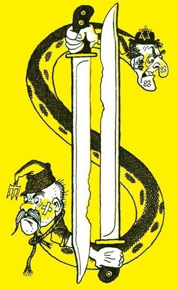 The de-humanization by the assimilation to a snake is a classic of anti-Semitic iconography since late 19th Century, like the big nose of the Jewish face. The assimilation of the Jews to American finance (here, the dollar) is another classic. What is more original hear is the strict equivalence between “Zionism” and Ukrainian patriotism, as dangers on equal terms for the USSR.