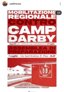 In July 2025, USB Tuscany organized a regional mobilization against the presence of the US Army base, Camp Darby, in Tuscany, calling for its “conversion to civilian use”. The event was organized in response to the US bombing of the Iranian nuclear sites as stated on the groups’ Instagram.