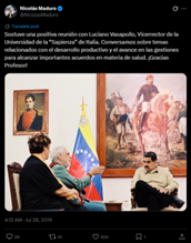Vasapollo has been photographed in Caracas next to Venezuelan dictator and Cartel de los Soles leader, Nicolas Maduro and, in September 2025, he stated that Venezuela “is a hope, not a threat” and he accused the United States of pushing for a military escalation against Maduro.