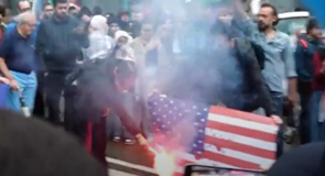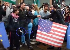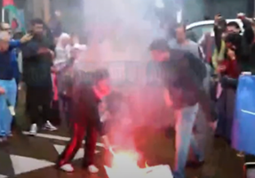 The sequence of a video taken on September 22, 2025, in Milan shows far-left demonstrators burning a US flag: